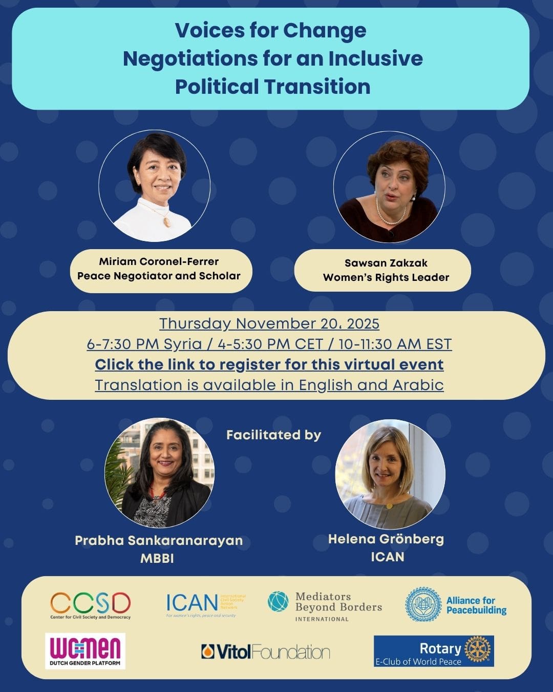 Register here! اضغط هنا للتسجيل Join us for the final Voices for Change conversation of the year — a powerful discussion on Negotiations for an Inclusive Political Transition. Together with…
