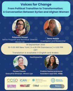 Join us as we listen to Syrian and Afghan women in dialogue, amplifying their insights, best practices, and calls to action for building a future rooted in resilience and transformation. Speakers Palwasha Hassan and Sema Nassar will reflect on their experiences of leading through moments of profound transition. Coming from two regions that have faced conflict, upheaval, and shifting political landscapes, these women will share how they have mobilized communities, built resilient civil society structures, and drawn on the strength of diaspora networks to sustain hope and drive change. The dialogue will spotlight the critical role of women’s leadership in contexts of transition, explore the lessons learned from their journeys and the strategies that have enabled them to transform challenges into opportunities for stronger, more inclusive communities.