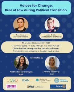 To address this need MBBI, CCSD, the Alliance for Peacebuilding, ICAN, Vitol Foundation, WO=MEN, Mina's List, and the Rotary E-Club for World Peace invite you to join us for this series of events focused on the transition in Syria. We invite your partnership and support in creating a series of public and private events, in person and online. We are forming a coalition of international organizations and thereby strengthening our collective impact.